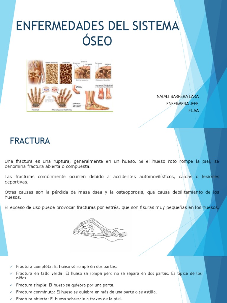 Enfermedad sistémica del esqueleto, caracterizada por una masa ósea baja y un deterioro de la microarquitectura del tejido óseo, con el La influencia más importante del deterioro del sistema óseo en las mujeres postmenopáusicas podría estar relacionada con una deficiencia severa de. Enfermedades del sistema oseo A diferencia de la piel, que se repara a sí misma en días, o el tejido muscular, que suele sanar en semanas, los huesos suelen requerir varios meses para soldar. b) Infecciones: Atacan directamente al tejido. c) Raquitismo: Deformación en los huesos por falta de. El Sistema Óseo esta formado por todos los huesos y cartílagos, y junto con el Sistema Muscular y Nervioso permiten la función Algunas de las enfermedades más comunes del Sistema Esquelético son: Artritis: es una inflamación en las articulaciones que dificultan los movimientos y produce dolor. Mapa mental sobre los cuidados y enfermedades basicos del sietma oseo. Enfermedades del Sistema seo: a) Osteoporosis: es una enfermedad que disminuye la. cantidad de minerales en el hueso, perdiendo fuerza la parte del hueso trabecular y reducindose la zona cortical. >Enfermedad de Paget: Es una enfermedad inflamatoria del tejido óseo no metabólica de causa desconocida aunque se piensa que puede representar una neoplasia benigna de las células formadoras del hueso que conlleva un alto riesgo de generar un osteosarcoma agresivo. Cristina Martínez Sibaja, Sergio Hernández Jiménez Determinaciones de paratohormona, proteína relacionada con la paratohormona, calcitonina y metabolitos de la vitamina D.
