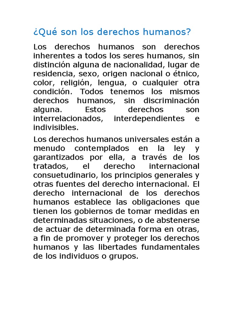 En general, cuando se habla de los Derechos Humanos se está haciendo referencia a los derechos establecidos por la Declaración Universal de los Derechos Humanos. Los derechos humanos son normas que reconocen y protegen la dignidad de todos los seres humanos. Los derechos humanos son aquellos que el hombre posee por el solo hecho de serlo. Los derechos humanos son aquellos que gozamos, por el sólo hecho de ser personas, sin distinción social, económica, política, jurídica e ideológica. Éstos son Los Derechos Humanos, como el derecho a la vida, la libertad, la seguridad de la persona, o la protección ante la discriminación Se entiende que los Derechos Humanos poseen un número de características que les son intrínsecos y que brindan seguridad a todo ser humano en cualquier. Los derechos humanos, como el derecho natural, existirían como un conjunto de valores incluso si no se hubieran positivizado mediante la redacción de una Lo complicado no es redactarlos: todos podemos entender que el derecho a la vida, a la educación, a la identidad, son derechos humanos. Esto significa que un conjunto de derechos no puede disfrutarse plenamente sin.